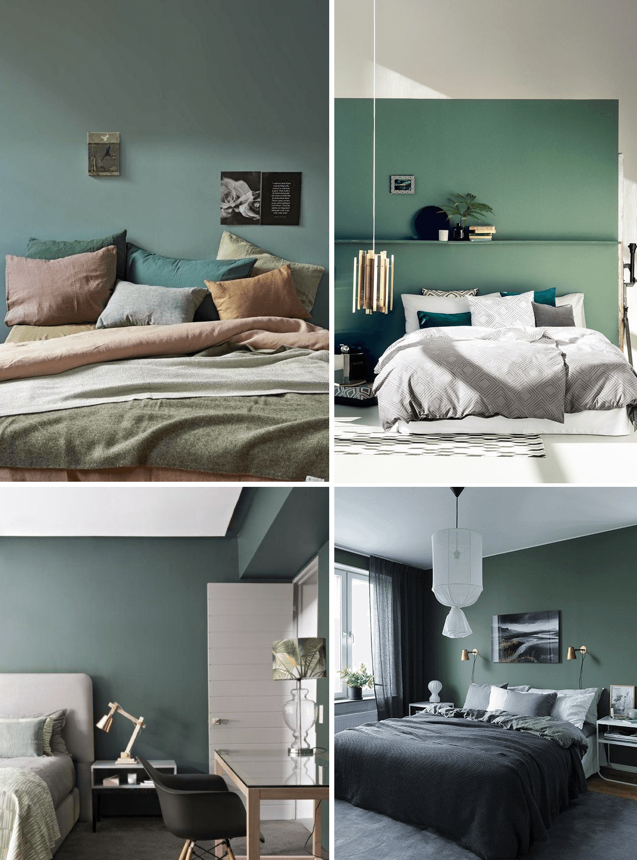 اللون الثاني الذي يناسب غرف النوم هو الاخضر، فالاخضر يشعر بالوان الطبيعة و يخفف من الضغوطات اليومية التي تواجه الانسان في حياته. تعطي دفء اكثر اذا كانت درجة الاخضر قاتمة.