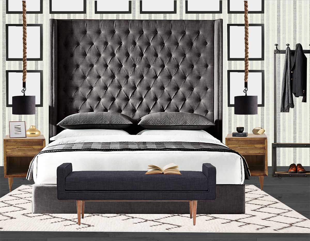 على الرغم من أن هذه الغرفة بألوان غامقة, إلا أنها بالتأكيد تصلح للذكور و الإناث. لكن سميتها بهذا العنوان “غرفة نوم بطابع رجالي” لأنها بألوان ذكورية و تبرز النمط الصناعي الذكوري. فالألوان البارزة فيها هي الرمادي الغامق الذي نراه في غالب الغرفة في السرير الذي يطغي بتصميمه على جمال الغرفة من محل Restoration Hardware في الأرضيات بالخشب الرمادي من معرض الصراف للديكور, البني في الخشب مثل الطاولات الجانبية التي أخذناها من West Elm و بالحبال المعلقات التي أعجبتني في محل Pottery Barn, الأبيض في السجادة التي أخذتها من Zara Home, غطاء السرير و ورق الجدران و أما الأسود ففي المعادن و إطار اللوحات التي أعجبتني من IKEA و المعلقات على يمين و يسار السرير. أما اللون الذي كسر هذا الجمود كان في الاكسسوارات التي انتقيتها من House Doctor